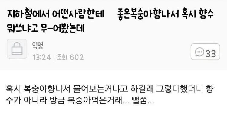 프로필 사진 복숭아향 좋길래 향수 뭐 쓰냐고 물어봤는데 Level 49주운상자속에서+5 조회수 : 23 |  26.02.09