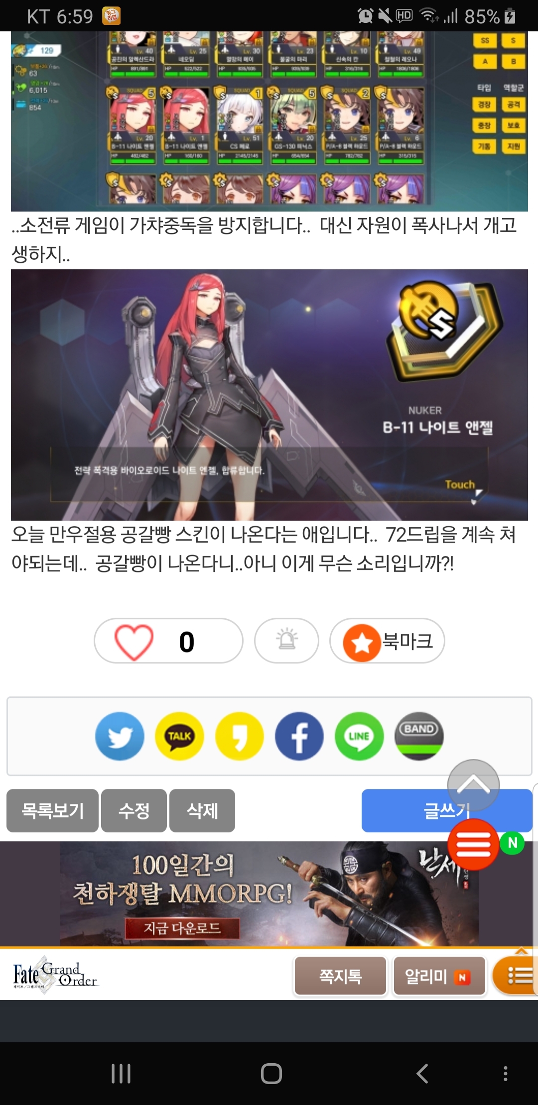 잡담 오늘은 보라 하마가 헝그오 일일관리자애요